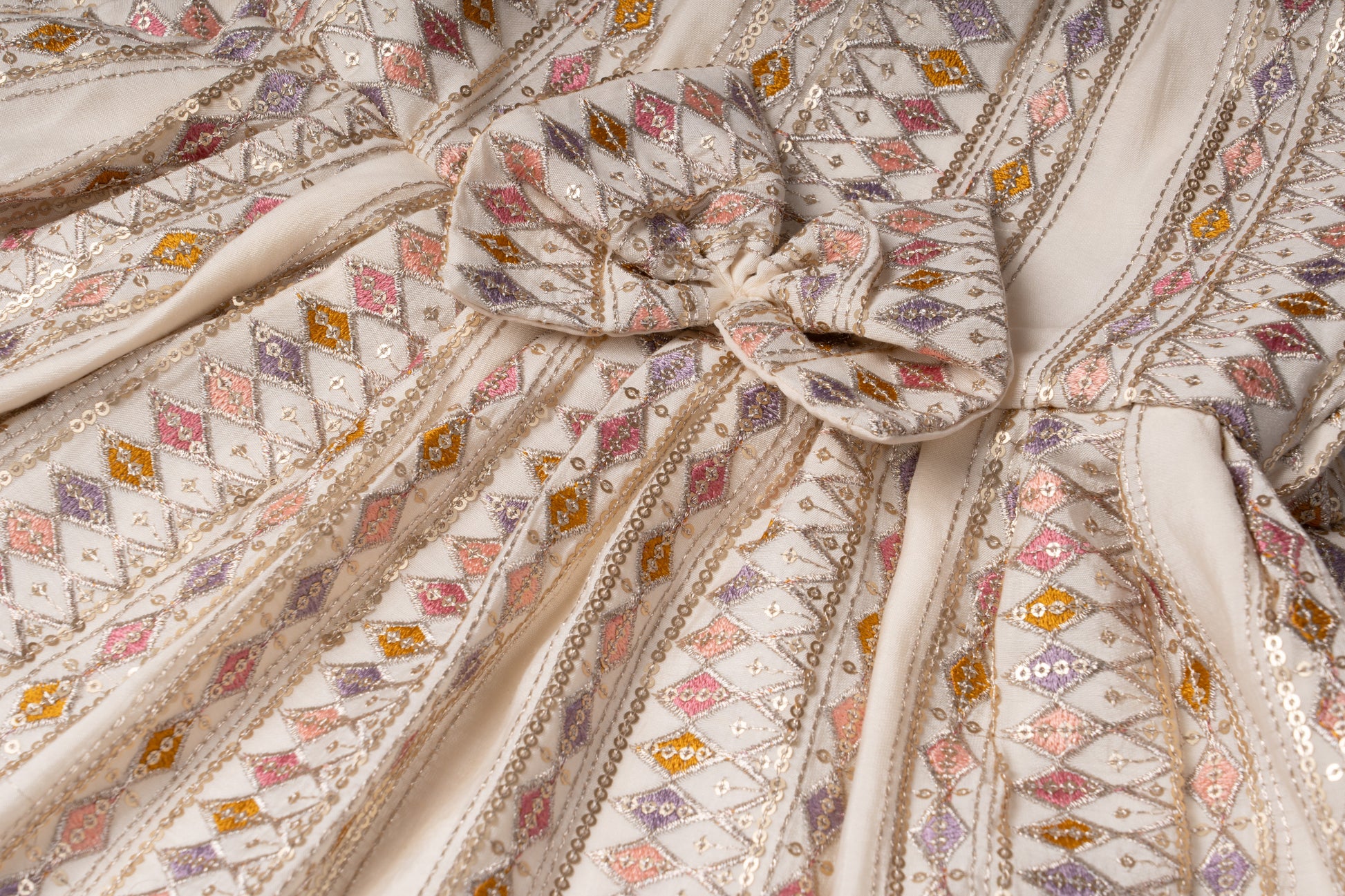 A majestic off-white silk dress with royal mirror work—perfect for regal festive moments.