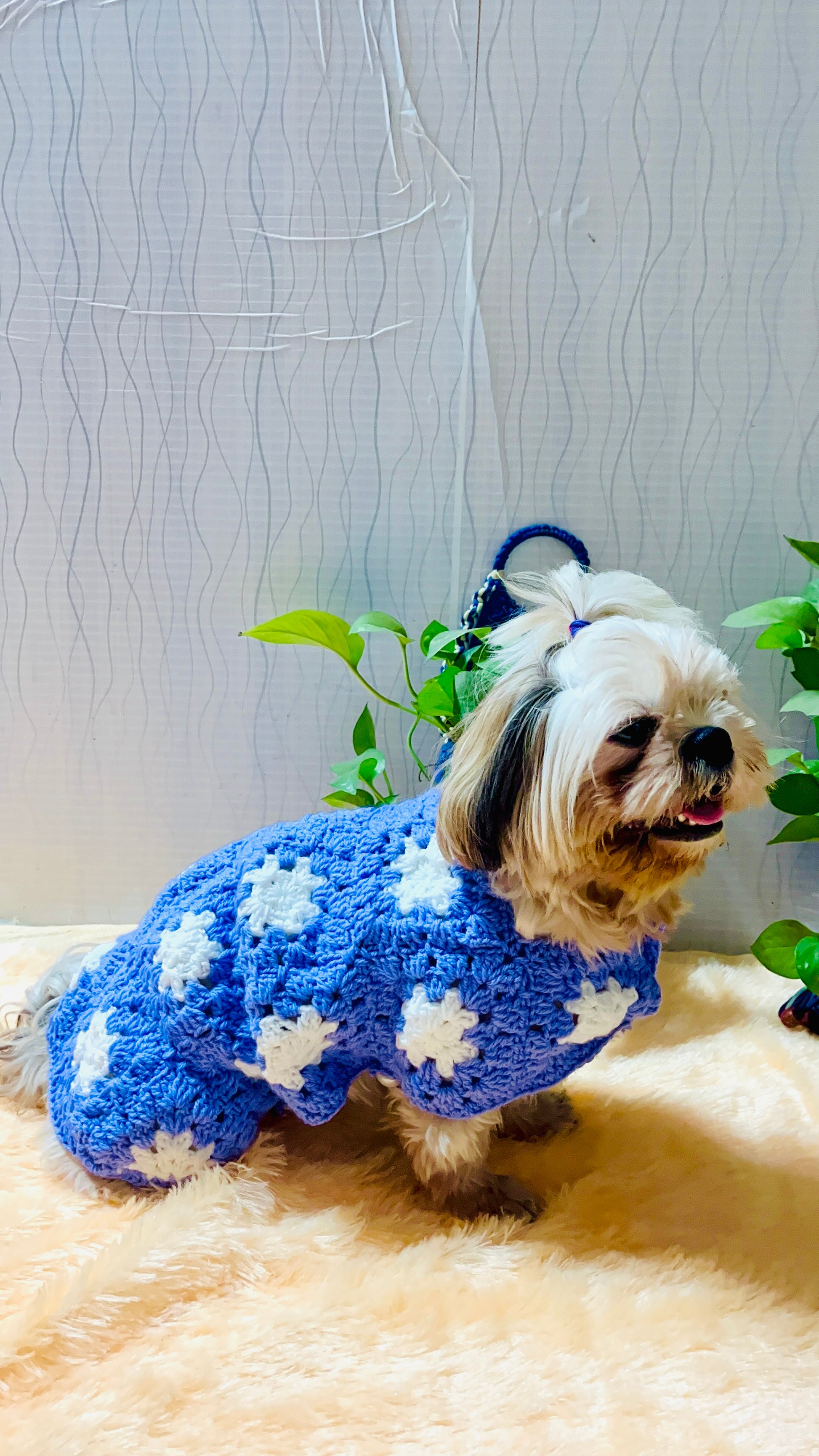 Keep your furry friend warm and stylish with our handmade knitted dog sweater in a beautiful blue and white crochet pattern. Crafted with soft, high-quality yarn, this cozy pet outfit ensures comfort while adding a trendy touch. Perfect for small to medium-sized dogs, it provides warmth during chilly days and makes your pup stand out in any setting. Ideal for everyday wear, special occasions, and photoshoots. Order now and give your pet the comfort they deserve!