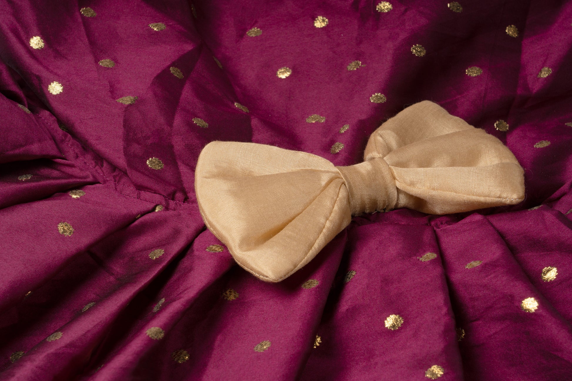 Traditional charm meets pet fashion in this beautiful dress with a festive hairbow to complete the look.
